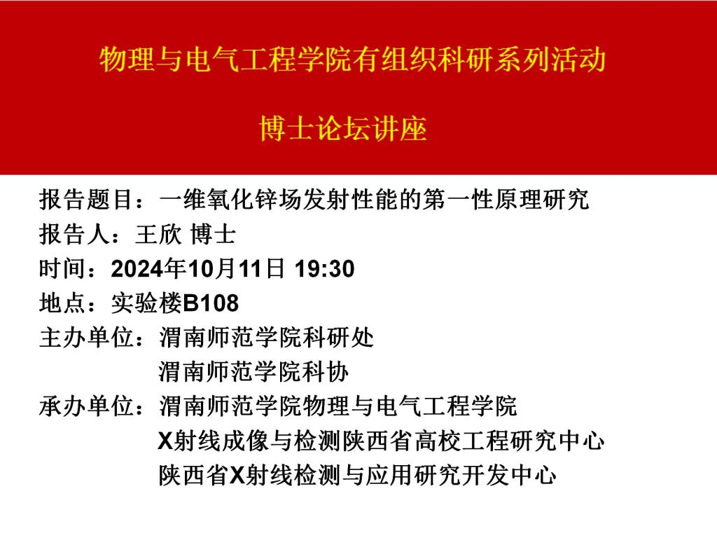 10月11日,18luck新利网址物理与电气工程学院科研系列活动博士论坛讲座由王欣博士做学术交流。报告交流题目为:一维氧化锌纳米结构场发射第一性原理研究。报告会由物理与电气工程学院副院长何冰主持,薛晶、王志全、薛攀攀、董陈岗、李盼、王之墨、杨瑞平、赵晓云等多名博士参加了本次交流会。